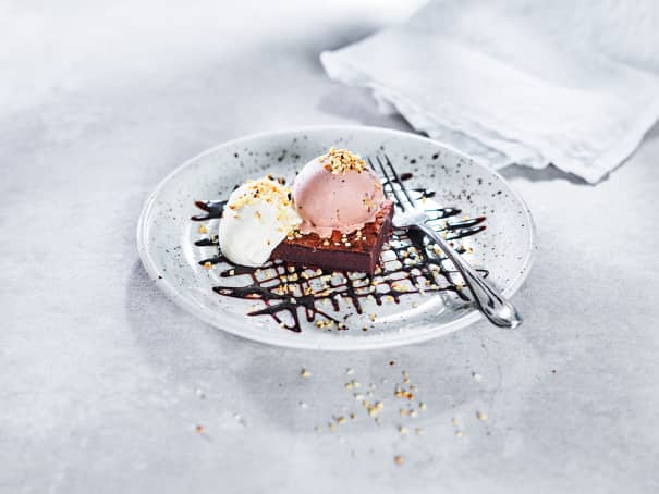Kladdig brownie som serveras med chockladglas, nötkross, grädde och chockladsås.
