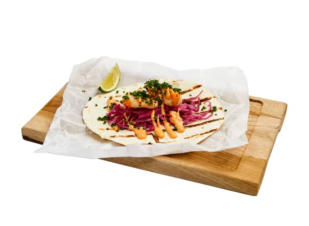 Tortillabröd med frasigt friterade vannameiräkor, jalapeñopicklad slaw, chilimajonnäs och lime. Toppas med gräslök.