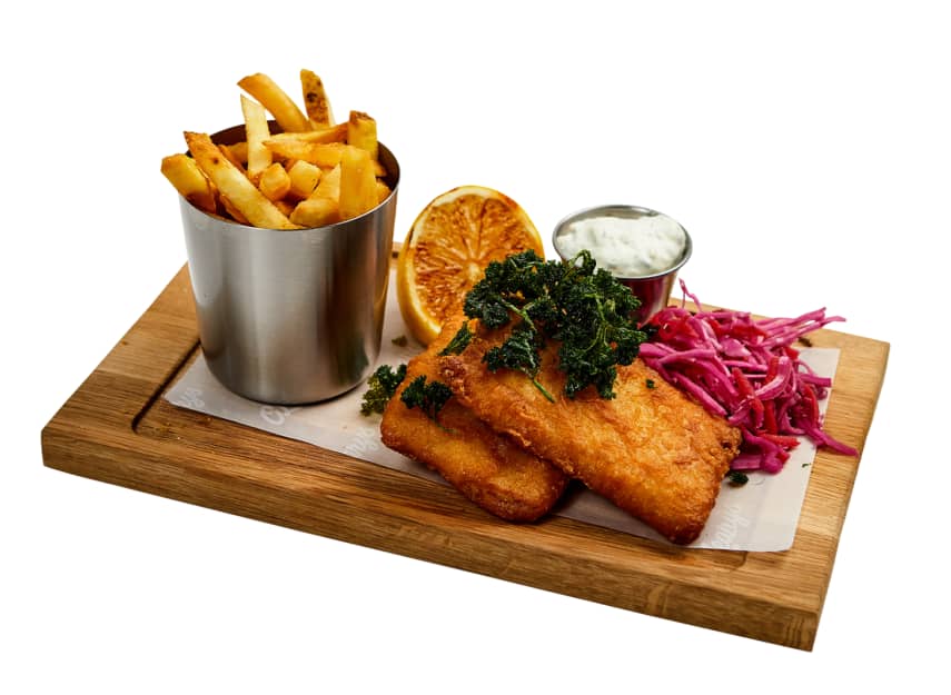 Frasigt friterad torskfilé som toppas med friterad persilja. Serveras med tartarsås, grillad citron, jalapeñopicklad slaw och pommes frites.