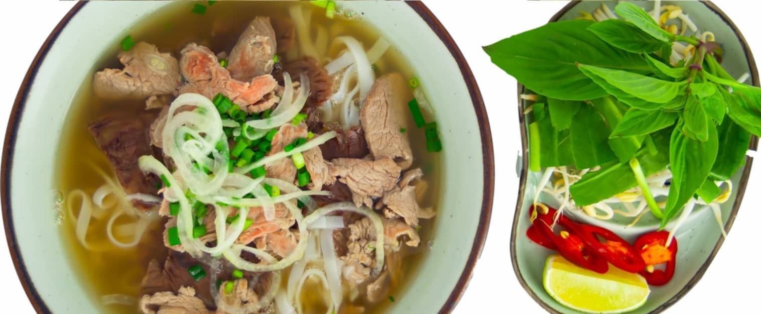 Pho Bo – Risnudelsoppa med biff, serveras med färska örter.