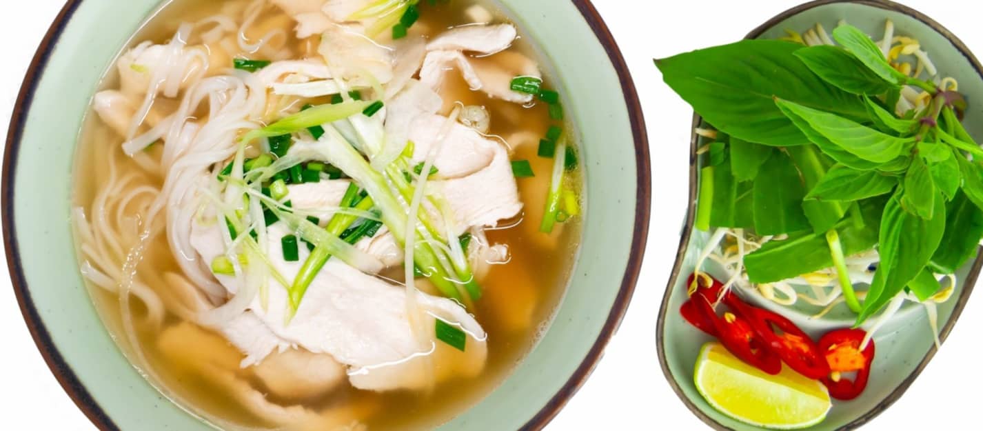 Pho Ga - Risnudelsoppa med kyckling, serveras med färska örter.