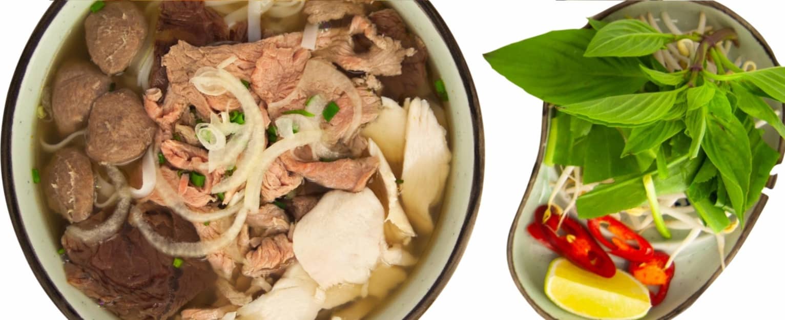Pho Dac Biet – Risnudelsoppa specialare med biff & kyckling, serveras med färska örter.