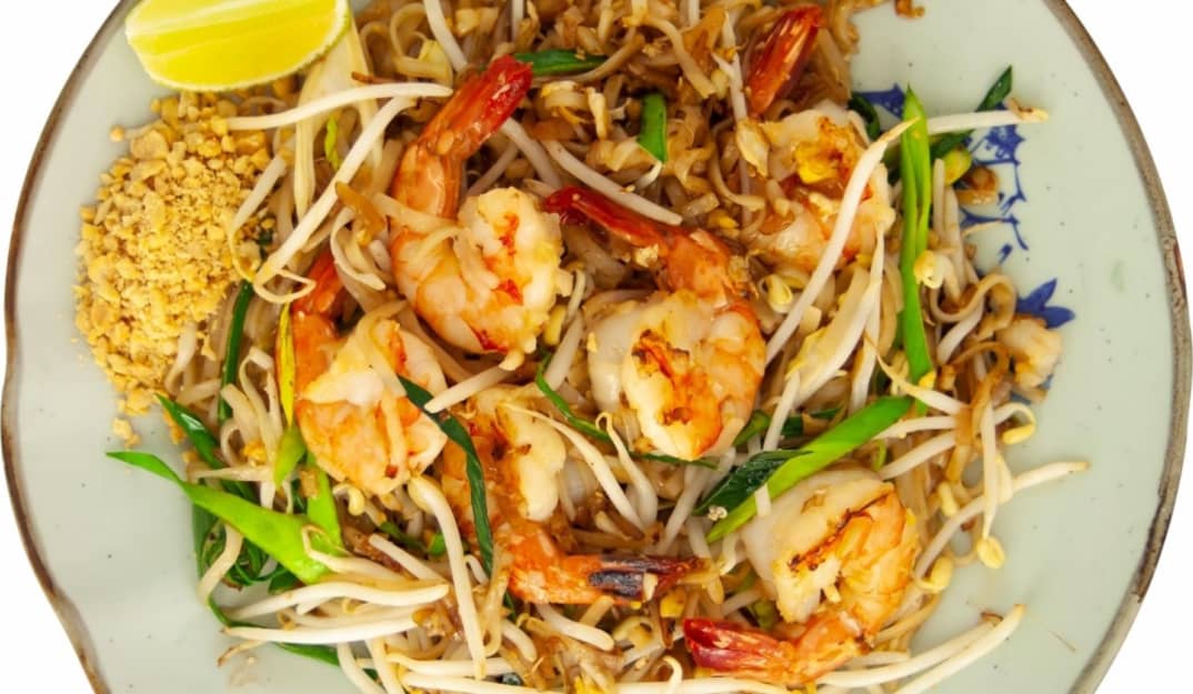 Pad Thai – Stekta risnudlar med räkor och grönsaker. Serveras med krossade jordnötter.