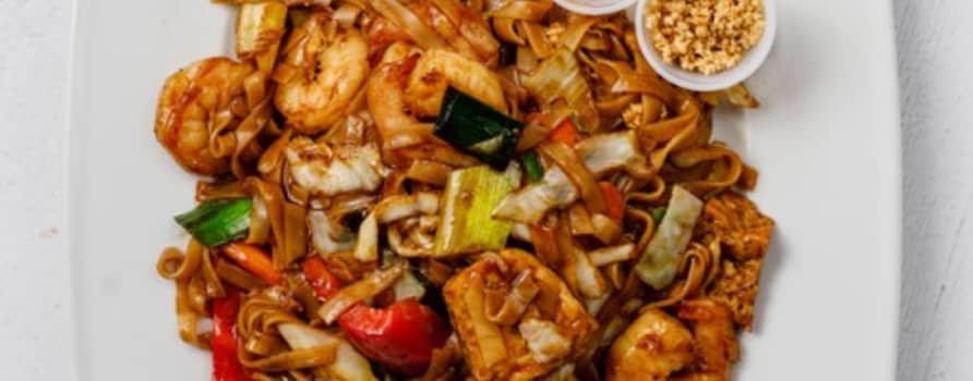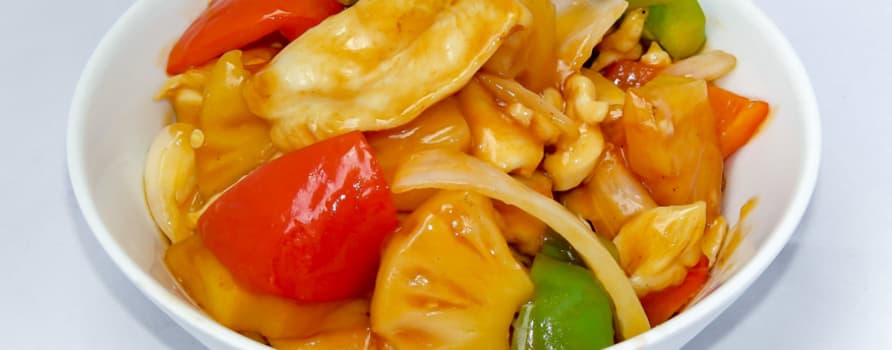 Friterade räkor, Kycklingspett med jordnötsås, Biff med bambu och champinjon.