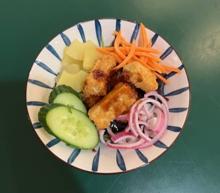 Tofu, ris, ananas, bönor, syltad lök, sojasås 1 chili = stark 2 chili = mycket stark 3 chili = ännu starkare Allergiinformation: *Spice ´N Rice egna woksås innehåller en liten mängd vete, så alla som i vanliga fall klarar av att äta soja, kan äta vår woksås.