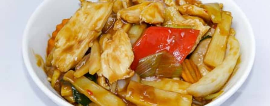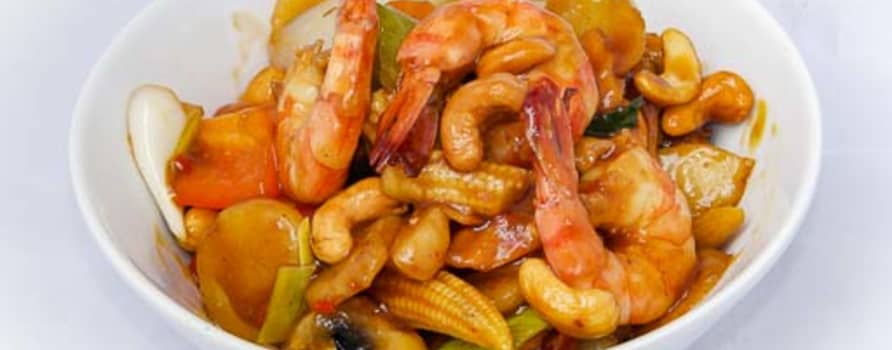 Friterade räkor, Kycklingspett med jordnötsås, Biff med bambu och champinjon.