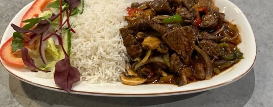 Wokad oxflilé med grönsaker. Serveras med ris och sallad