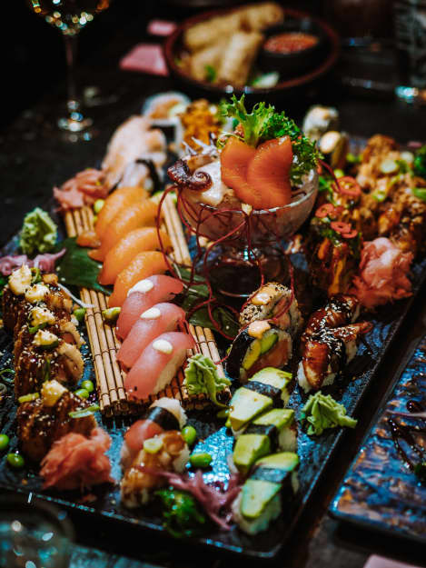 Kockens Lyx Mix! 16 Nigiri, 30 Lyx Maki, 4 Sashimi Serveras på gemensam tallrik med alla tillbehör.