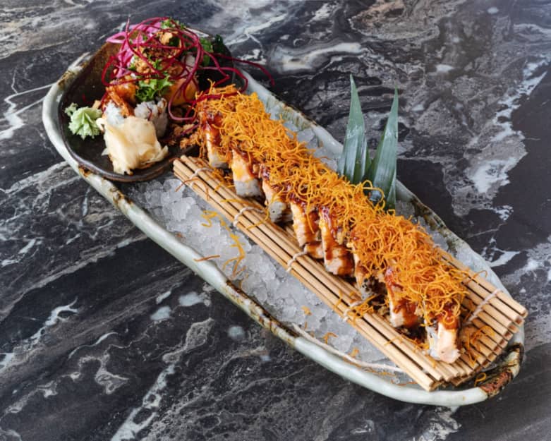 10 bitar Friterade räkor, avokado, friterade grönsaker, krispsallad toppad med eldad lax & 3 såser