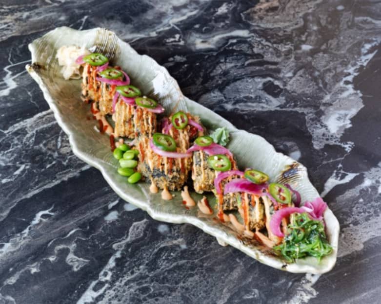 Marinerad lax, avokado, gurka, krispsallad. Krispig Pankopanerad och friterad på utsidan toppad med chilimajonäs och chilisås. (går ej att beställa glutenfri)