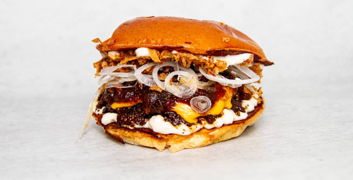 115g Svenskt nötkött Svart tryffelmajonnäs 2x Cheddarost Baconsylt Isad silverlök Rostad lök