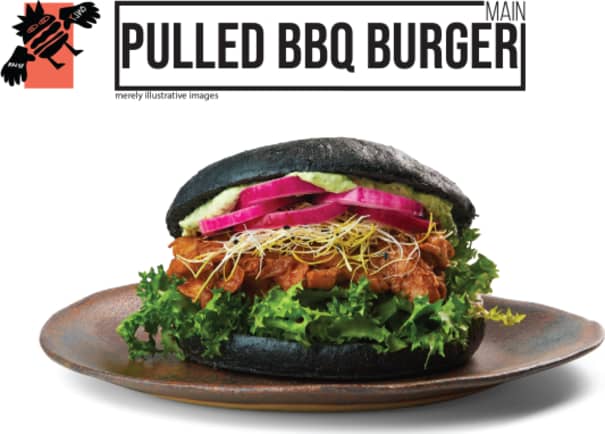 Svart burgerbulle, grillad drog BBQ sojakött, hemgjord dillmajonnäs, hemgjord söt picklad rödlök, sallad, groddar och ketchup.