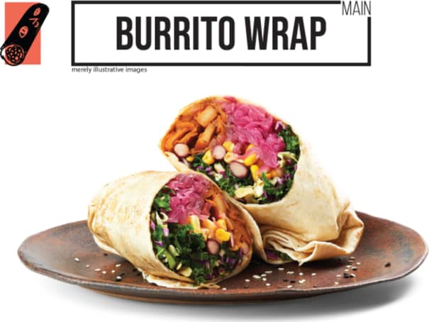 Tortilla, blandad grön sallad, hemgjord vegansk chipotle-majonnäs, hemgjord söt picklad lök, kryddig tomatsalsa, rödlök, chilibönor, sockermajs och grillad drog BBQ sojakött.