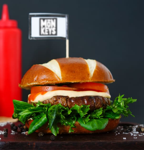 Biffen kommer på en rostad pretzel bulle med hemlagad aioli-majonnäs, krispig sallad, tomater och ketchup.