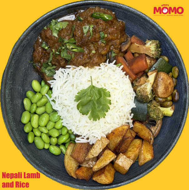 Nepali meat lovers' favorite lunch- tender Nepali-style lamb gravy over warm Basmati rice. Served with a side of tangy and spicy Aalu Sadeko.