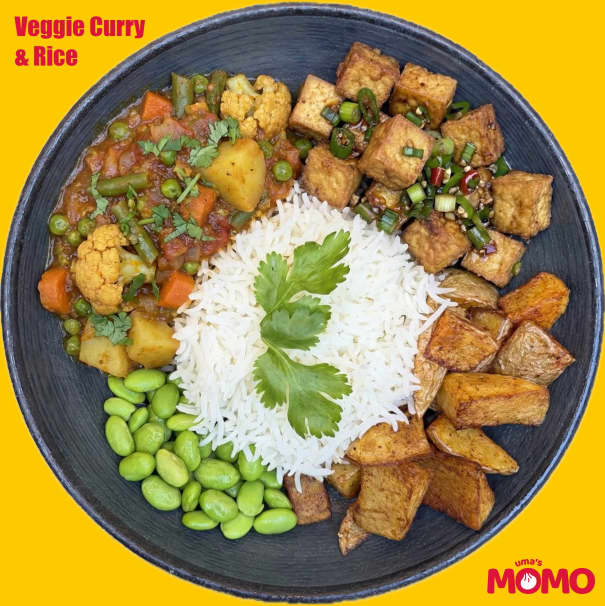 A flavorful vegetarian twist on Nepali dal bhat — savory Nepali-style vegetable curry over warm Basmati rice. Served with spicy and tangy Aalu Sadeko for a perfectly filling lunch.