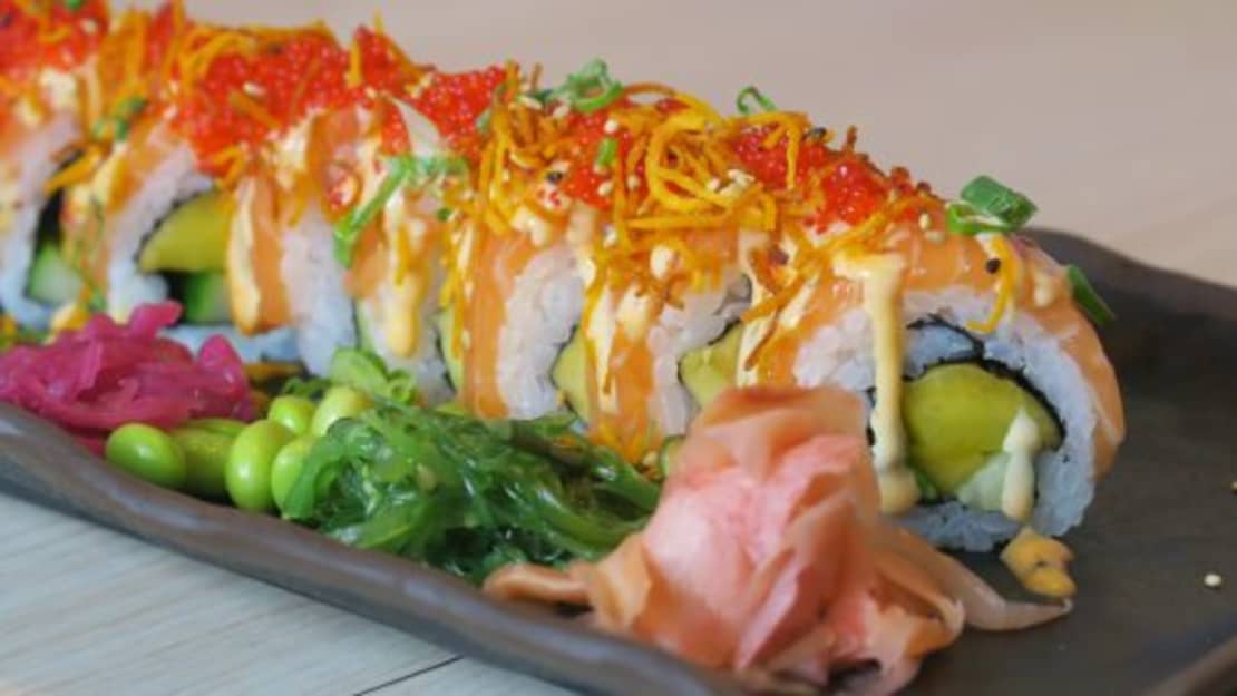 10 bitar | kan ej kombineras med andra menyer. Avokado, gurka, mango, toppad med lax, chilimajo,fiskrom, vårlök ( Soja, wasabi, ingefära, sjögrässallad & edamebönor ingår).