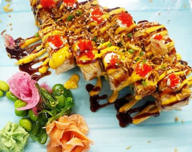 10 bitar | kan ej kombineras med andra menyer. Tempurafriterad räka, avokado, gurka, toppad med lätt flamberad lax, unagisås, chilimajo, philadelphiaost, fiskrom, vårlök ( Soja, wasabi, ingefära, sjögrässallad & edamebönor ingår).