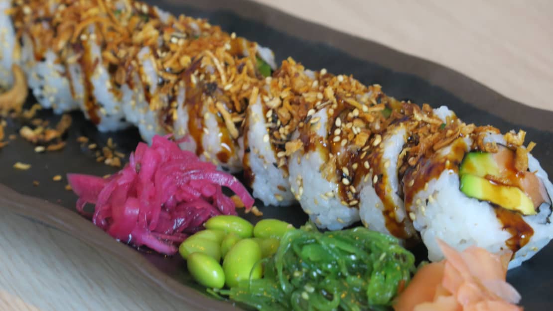 Lax, avokado, gurka, toppad med rostad lök, unagisås. ( Soja, wasabi, ingefära, sjögrässallad, edamamebönor och inlagd rödlök ingår) Miso soppa ingår. (Finns i restaurangen för självservice)