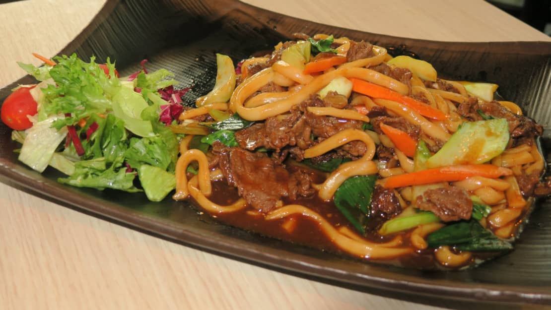 Stekta risnudlar med Entrecôte, husets specialsås och säsongens grönsaker.