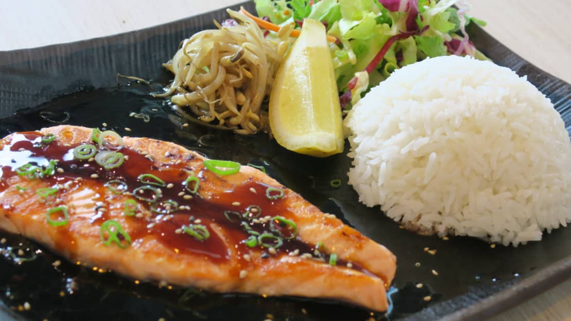 Teppanstek lax med teriyakisås, säsongens grönsaker