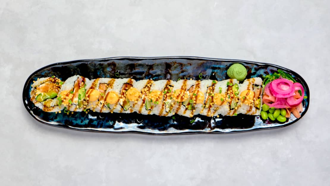 Lax med avokado, gurka, philadelphia. Toppas med chilimayo, rispuffar & gräslök.