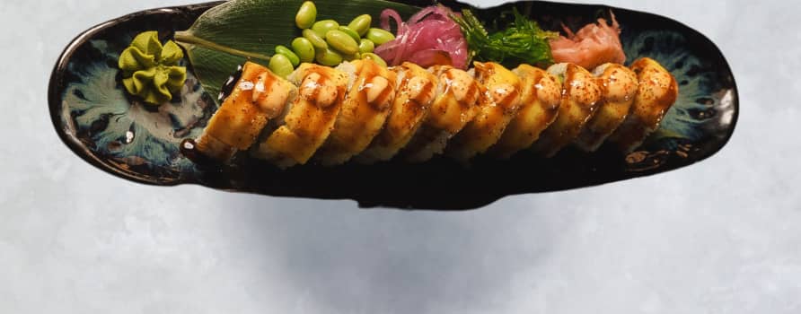 Friterad tempuraräka & avokado. Toppas med avokado, chilimayo, teriyakisås, gräslök & rostad lök. (går inte att få glutenfri)
