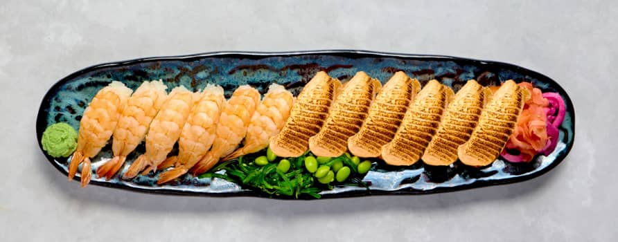 Vår lax nigiri kan du beställa rå eller flamberad.