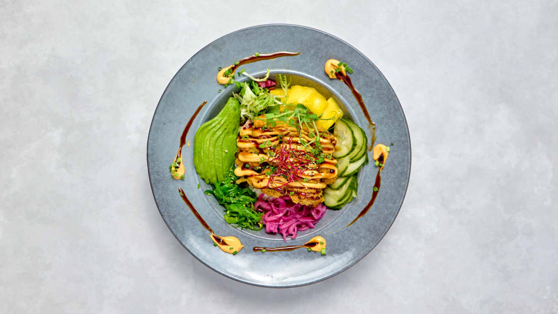 Popcornkyckling med ris, gurka, picklad rödlök, mango, edamame, avokado, salladsmix, wakame, chilimayo & teriyakisås. Toppas med sesamfrön & gräslök. (går inte att få glutenfri)