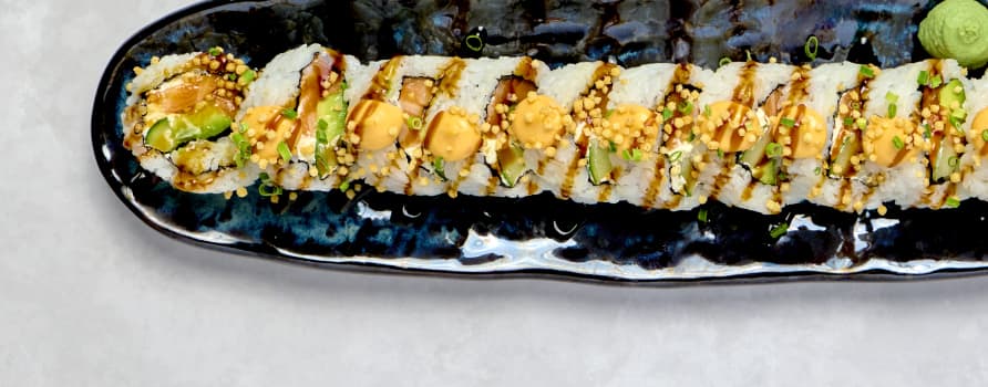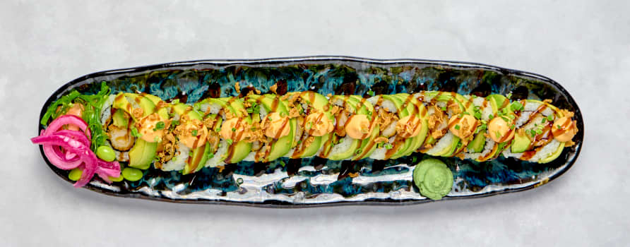 10 bitar friterad tempuraräka & avokado. Toppas med avokado, chilimayo, teriyakisås, gräslök & rostad lök.