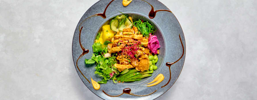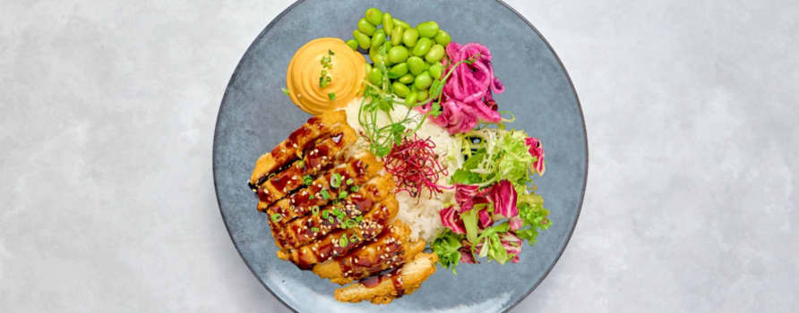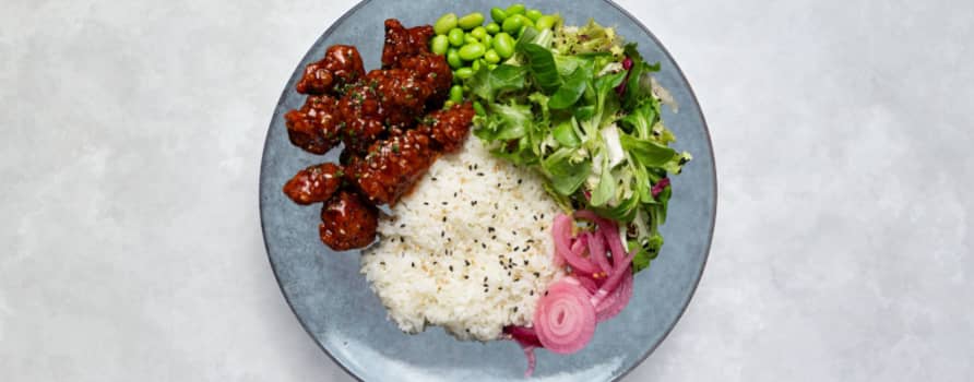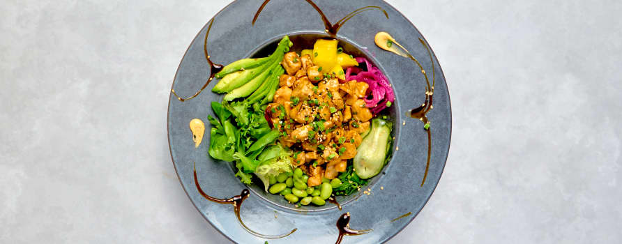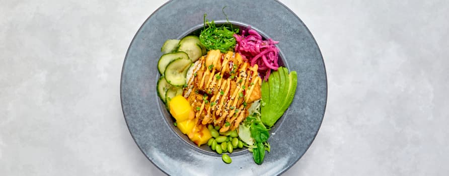 Pankofriterad kycklingfilé med ris, picklad rödlök, salladsmix & sojabönor. Toppas med chilimayo & teriyakisås.