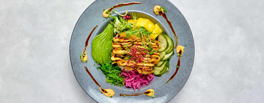 Pankofriterad tofu med ris, gurka, picklad rödlök, mango, edamame, avokado, salladsmix, wakame, vegansk chilimayo & teriyakisås. Toppas med sesamfrön & gräslök.