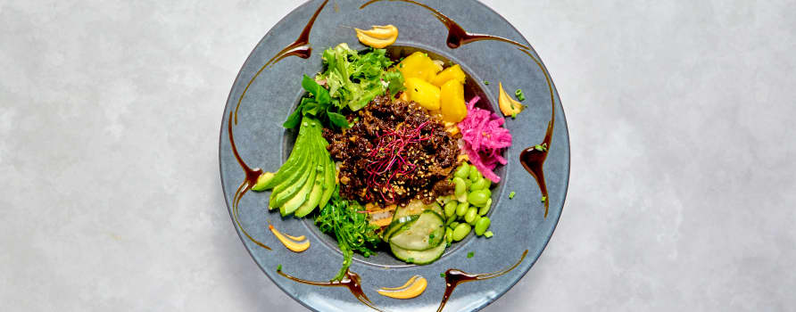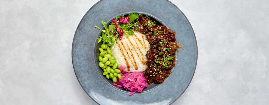 Marinerad entrêcote med ris, picklad gurka, picklad rödlök, mango, edamame, avokado, salladsmix, wakame, chilimayo & teriyakisås. Toppas med sesamfrön & gräslök.